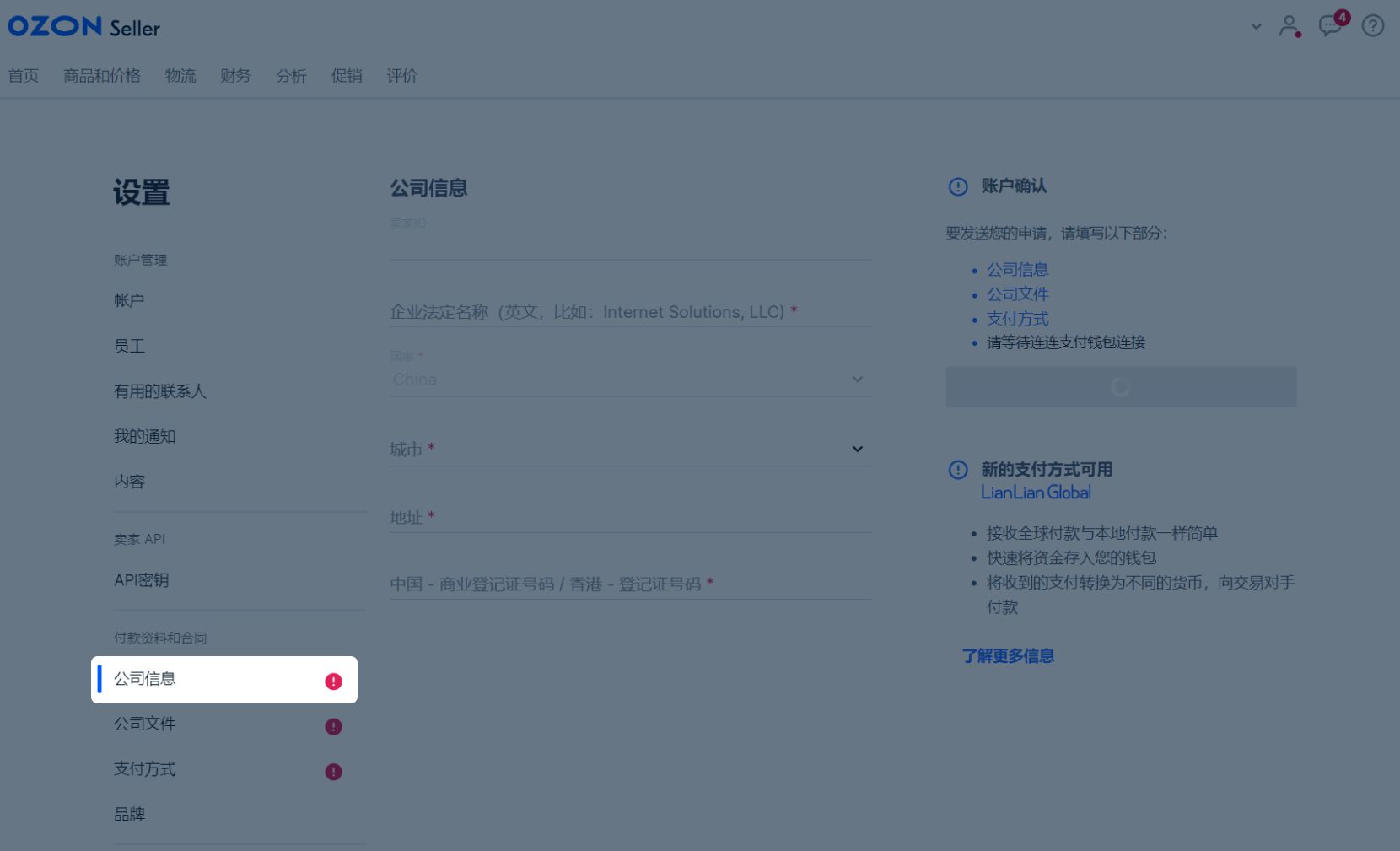 之后点击绑定钱包,在打开的窗口中,在连连支付平台上进行授权或注册。注册时,请将您公司的企业钱包绑定至Ozon。然后,转到卖家个人中心。填写完所有字段并点击 “发送以供审核”,激活步骤就全部完成了!
