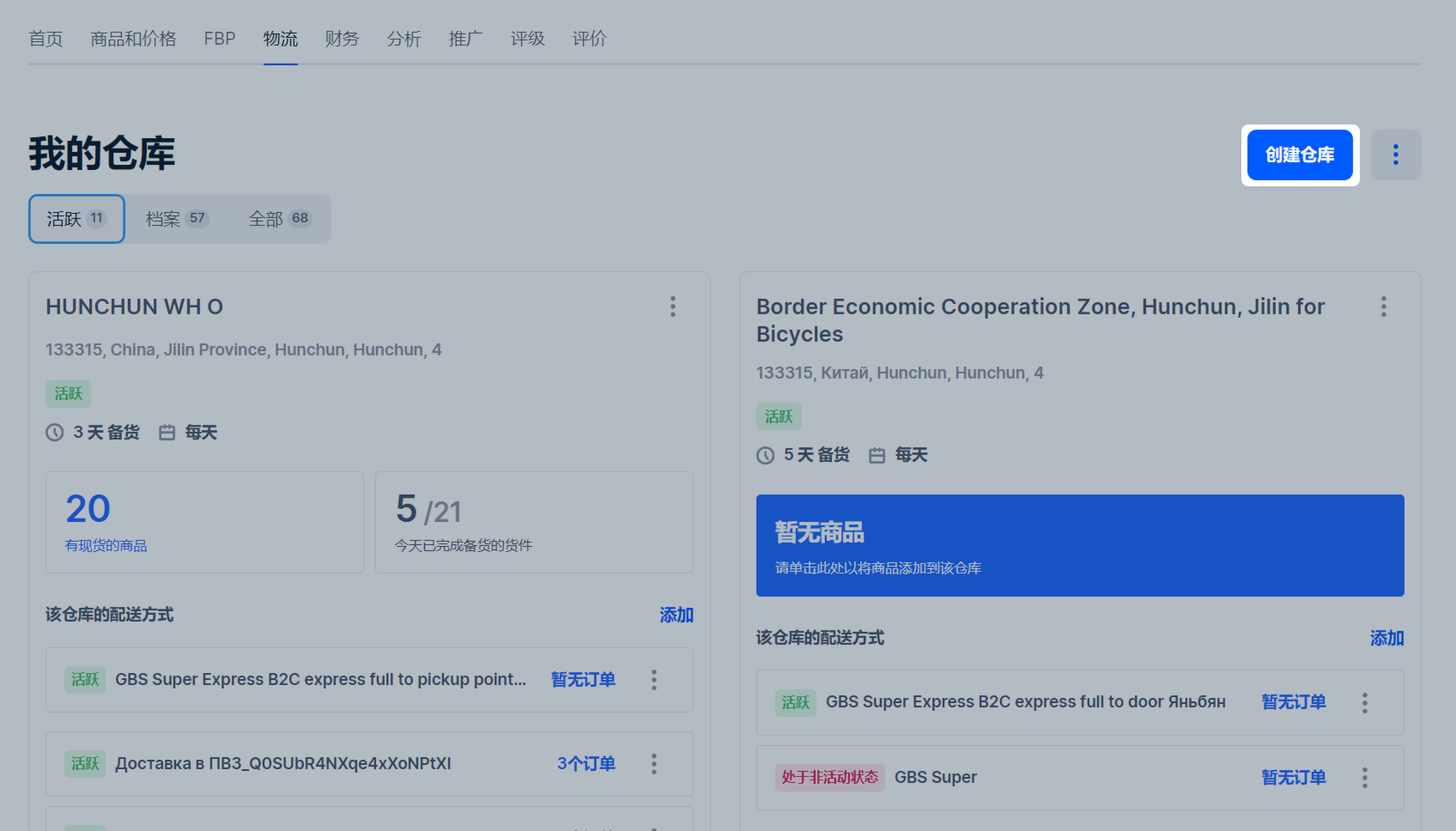 在个人账户中进入 物流 → 仓库和方式 并单击 创建仓库。